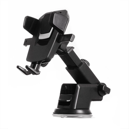 Universal car phone holder with long, telescopic arm that extends from 11,8 to 16,5 cm. Made of high-quality materials (PC + silicon) mount could be attached either to dashboard or windshield. Designed for smartphones with 5,5 to 8,5 cm width. Also, the accessory has one touch mounting system that locks and releases the device with just a push of a finger. Fully adjustable with 360 rotation allows you set it at perfect viewing position so it will not block your sight while driving.