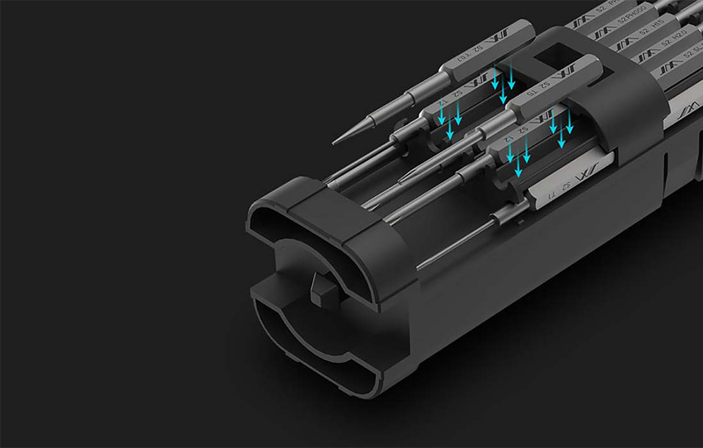 Każdy z bitów ma swoje dedykowane miejsce, z magnetycznym mocowaniem. Dzięki temu nigdy nie zrobi się bałagan wewnątrz obudowy, a każdy z bitów będzie zawsze na swoim miejscu. Przyspieszy to również każdą naprawę, którą musisz wykonać.